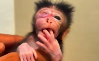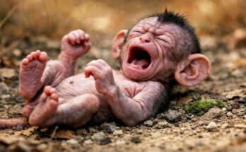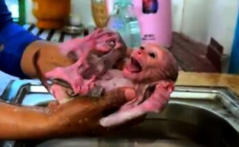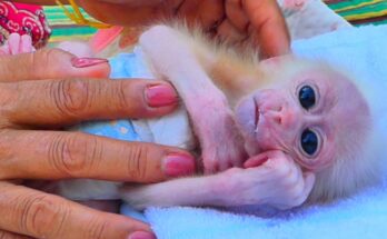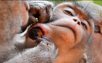 In a quiet corner of the forest, a poor abandoned newborn baby monkey lay helpless, its tiny body trembling with weakness. Its eyes were swollen and barely open, showing signs …
