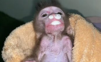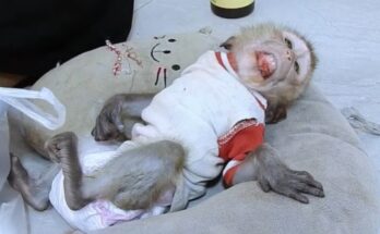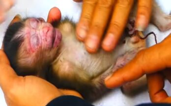 Deep in the quiet forest, where sunlight barely touched the ground, a poor baby monkey struggled to move. His tiny body trembled with every step he tried to take. Just …