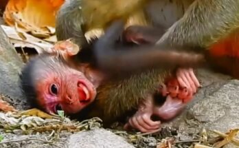 Under the quiet shade of a tall tree, a tiny newborn monkey lay curled against its mother’s thin chest. Its eyes were half-closed, heavy with exhaustion, yet its small hands …